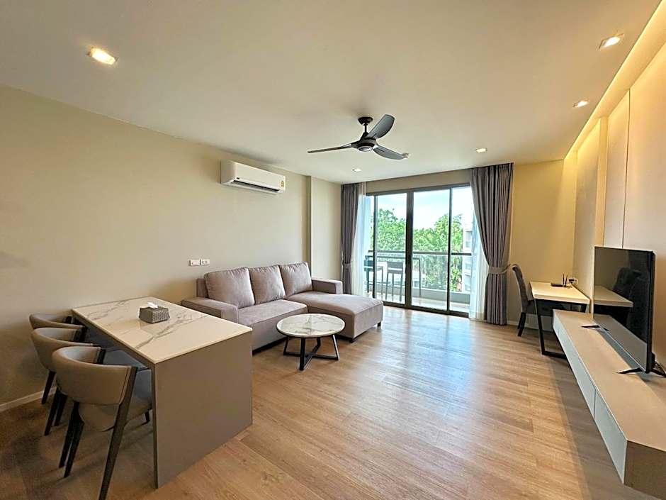 This spacious 2-bedroom unit offers a living room with a flat-screen TV, a sofa and a dining area.